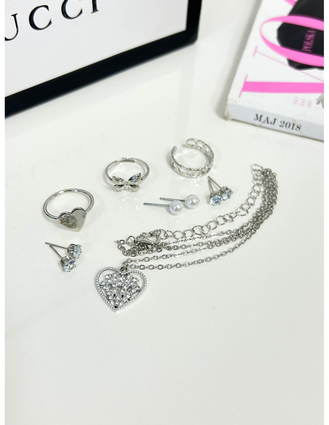 Zestaw delikatnej biżuterii – srebrny Odkryj esencję elegancji z naszym srebrnym kompletem biżuterii, idealnym akcentem do każdej damskiej garderoby. Naszyjnik z sercem, osadzony lśniącymi kamieniami, dodaje subtelnego blasku. Delikatne kolczyki-stud oraz te z kryształkami oferują wszechstronność na każdą okazję. Pierścionek z motylem i pierścionek z sercem to wyjątkowe symbole kobiecości i miłości. Każdy element zestawu jest starannie wykończony, gwarantując wytrzymałość i długotrwały blask. Ten komplet to doskonały wybór dla kobiety ceniącej klasykę i nowoczesność.