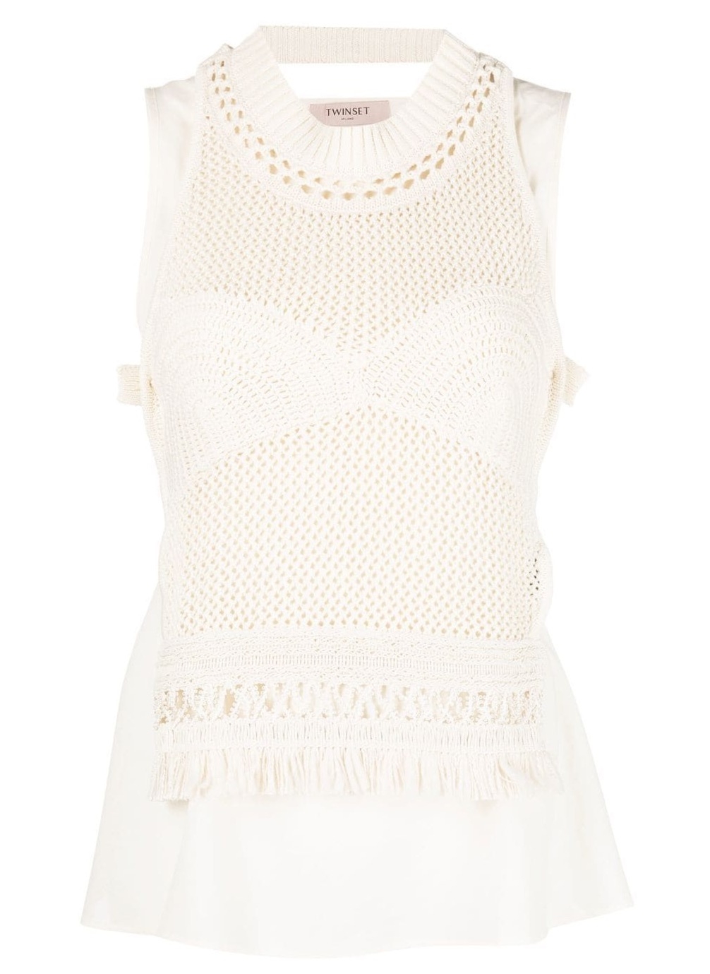 Bluzka Twin Set z ażurowym wzorem.  To propozycja dla fanek klasyki z dodatkiem nietuzinkowych wykończeń. Bluzka ma dwie warstwy. Pierwsza to gładki top bez rękawów z przyjemnego w dotyku materiału. Druga część ma z przodu różnej wielkości sploty. Z tyłu wiązana jest na wąskie paski. Twin Set to marka pochodząca z Włoch, która słynie z ubrań doskonałej jakości. W każdej kolekcji znajduje się część zgodna z trendami, jak i ponadczasowe projekty. Każda kobieta znajdzie w niej ubrania i dodatki na każdą okazję.
