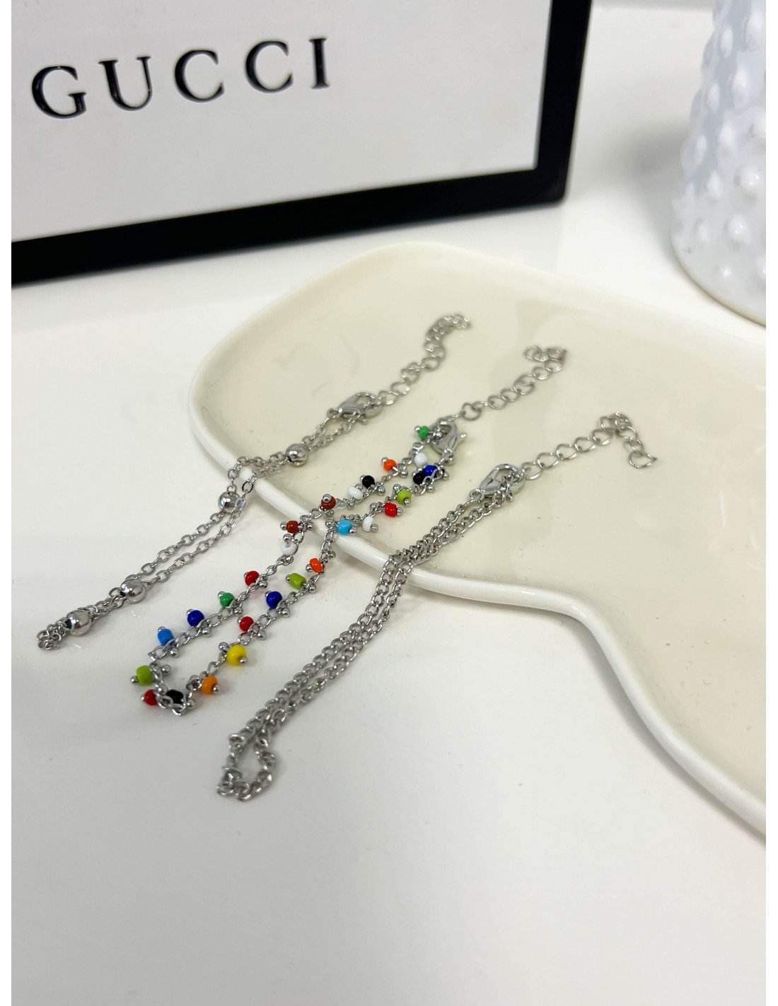 Bransoletki z koralikami – srebrna Zaprezentuj swoją radosną stronę z naszą najnowszą kolekcją kolorowych bransoletek, które są idealnym dodatkiem do każdego stroju. Te czarujące bransoletki są ozdobione tęczą żywych koralików, które pięknie odbijają światło, nadając iskrzący akcent Twojej garderobie. Subtelnie wplecione w srebrny łańcuszek, kolorowe koraliki tworzą wyjątkową paletę, która odzwierciedla energię i optymizm. Idealne do noszenia pojedynczo dla subtelnej poprawy nastroju lub w zestawie, aby stworzyć odważne, stylistyczne oświadczenie. Te bransoletki zostały zaprojektowane, aby pasować do różnorodnych okazji, od codziennych wyjść po wieczorne wydarzenia. Dają one swobodę eksperymentowania z kolorami i są doskonałym wyborem dla kobiet, które cenią sobie zabawę i ekspresję przez modę. Każda bransoletka to wyraz indywidualności i świetny sposób na dodanie kreatywnego akcentu do Twojego wyglądu