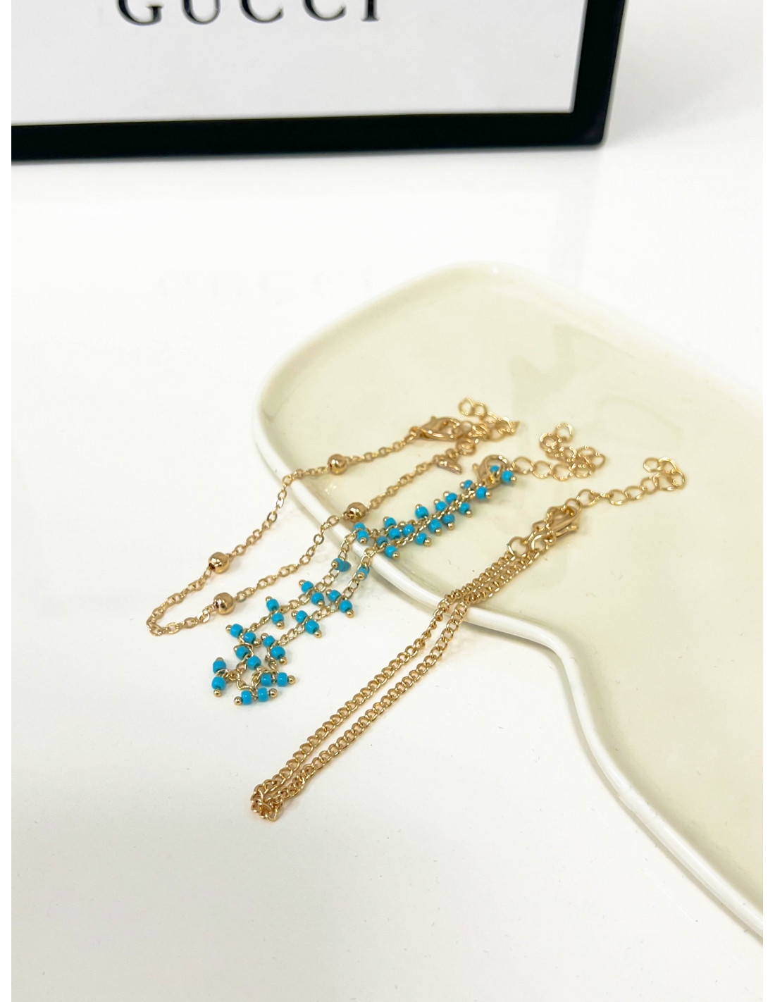 Bransoletki z koralikami – złote Odkryj czar naszej nowej kolekcji bransoletek, które są kwintesencją zarówno codziennej elegancji, jak i wieczorowej wytworności. Każda bransoletka z tej serii to połączenie delikatnego złota z akcentami hipnotyzującego błękitu, dodającym odrobinę koloru do każdego outfitu. Drobne, lśniące koraliki tworzą subtelną harmonię z ciepłym odcieniem metalu, tworząc biżuterię, która jest zarówno dyskretna, jak i zauważalna. Idealne do noszenia pojedynczo dla minimalistycznego uroku lub warstwowo, aby stworzyć bardziej wyrazisty efekt. Te bransoletki zostały stworzone z myślą o kobietach, które cenią sobie klasę i wszechstronność w swoich akcesoriach. Dodają one wyrafinowanego charakteru do casualowych jeansów, jak również doskonale komponują się z wieczorowymi sukienkami. Wspaniały dodatek dla każdej damy, pragnącej wnieść do swojego stylu odrobinę świeżości i elegancji.