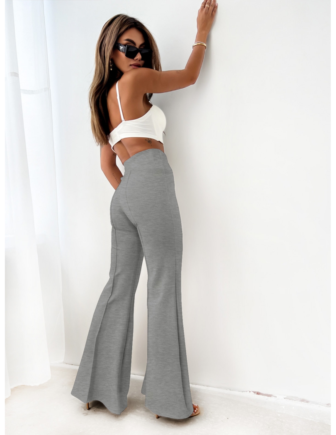Dopasowane spodnie dzwony modelujące MERRY – szary melanż Spodnie z wysokim stanem i szerokimi nogawkami to elegancki i nowoczesny element garderoby, który podkreśli każdą sylwetkę. Dzięki dopasowanemu krojowi w górnej części, spodnie te podkreślają talię, tworząc zgrabną i kobiecą linię. Szerokie nogawki nadają stylizacji lekkości i swobody, jednocześnie dodając elegancji. Model ten doskonale sprawdzi się zarówno w stylizacjach casualowych, jak i bardziej formalnych, idealnie komponując się z różnymi typami obuwia i topów. Stylowe detale, takie jak delikatne przeszycia oraz gładki, minimalistyczny design, czynią te spodnie uniwersalnym wyborem na wiele okazji. Spodnie te wyróżniają się także wygodą noszenia, dzięki elastycznemu materiałowi, który zapewnia komfort przez cały dzień. Doskonale sprawdzą się zarówno na co dzień, jak i na wieczorne wyjścia. Kolor szary melanż to klasyka sama w sobie.