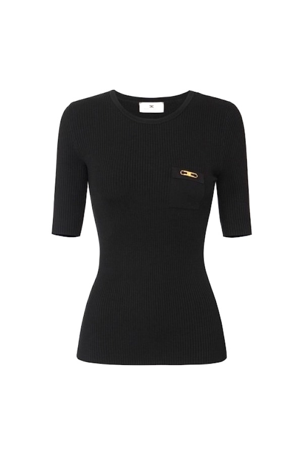 Dzianinowa bluzka Elisabetta Franchi z logo czarna.  Ma dopasowany fason, który podkreśla figurę i okrągły dekolt pod szyję. Rękawy mają długość tuż przed łokieć. Z przodu znajduje się niewielkie logo w złotym kolorze. Tshirt świetnie pasuje zarówno do codziennych, jak i eleganckich looków. Elisabetta Franchi to brand „made-in-Italy”, znany na całym świecie. Projekty włoskiej marki podkreślają kobiece piękno oraz są uniwersalne. Do jej fanek należą gwiazdy, m.in. Kate Hudson, Olivia Palermo i Emily Blunt.
