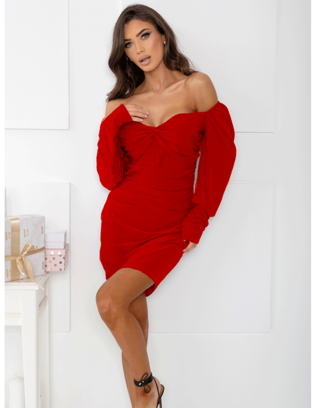 Elegancka sukienka mini z zakładkami XENIA – czerwona Szukasz idealnej kreacji na wieczorne wyjście, święta lub romantyczną kolację? Sukienka XENIA to kwintesencja elegancji i klasy, która zachwyca swoją unikalnością. Zmysłowy krój z ozdobnymi zakładkami i możliwością noszenia z odkrytymi ramionami sprawia, że ta sukienka będzie Twoim ulubionym wyborem na specjalne okazje. Gumki na ramionach – umożliwiają noszenie sukienki klasycznie lub z odkrytymi ramionami. Zakładki z przodu i z tyłu – optycznie wysmuklają sylwetkę i dodają elegancji. Podkreślający dekolt – idealnie eksponuje kobiecą linię. Długi rękaw zakończony gumką – zapewnia wygodę i lekkość. Doskonały wybór na wyjątkowe okazje, przyciągający uwagę i podkreślający pewność siebie. Na wieczór – połącz sukienkę z czarnymi szpilkami, kopertówką i dużymi kolczykami. Na przyjęcie – dodaj delikatny złoty naszyjnik i klasyczne sandałki na obcasie. Na święta – stwórz look z futrzanym płaszczem, cielistymi rajstopami i botkami na obcasie. Sukienka XENIA to propozycja dla kobiet, które chcą czuć się wyjątkowo i stylowo. Elegancka sukienka mini w kolorze czerwonym doda zmysłowości Twojej stylizacji. Zamów już teraz i zachwycaj na każdej uroczystości!