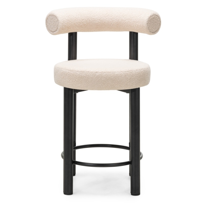 Hoker Pedro to stylowy i funkcjonalny wybór, który doskonale sprawdzi się ustawiony przy kuchennej wyspie, tworząc komfortowe miejsce do spożywania posiłków. Jego zaokrąglone oparcie zapewnia wygodę, tworząc idealną przestrzeń na chwilę relaksu. Miękka, beżowa tkanina boucle dodaje przytulności i elegancji, a regulowane, czarne nóżki gwarantują stabilność oraz stylowy kontrast. Dzięki harmonii materiałów i kształtów, krzesło barowe Pedro stanie się wyjątkowym elementem aranżacji, który zachwyci zarówno gości jak i domowników.