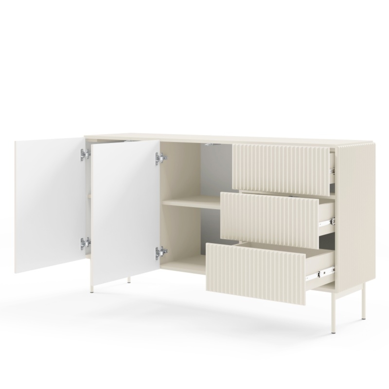 Komoda Muti łączy w sobie nowoczesną estetykę i codzienną funkcjonalność. Jej kaszmirowy odcień tworzy tło dla subtelnej gry światła na ryflowanej powierzchni, która nadaje bryle wyrazistości, pozostając w harmonii z całością.