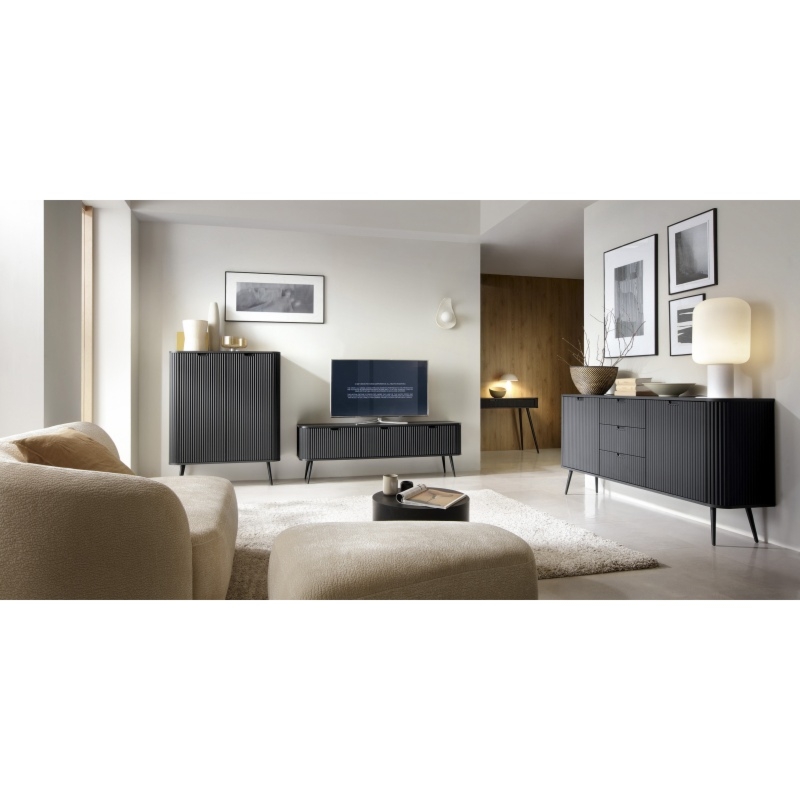 Zaokrąglone krawędzie nadają subtelności, podczas gdy ryflowany korpus dodaje tekstury, tworząc efektowne wrażenie już na pierwszy rzut oka. Czarne, wysokie nóżki dodają lekkości, podkreślając zarazem nowoczesny charakter mebla. Trzy pojemne szuflady oraz dwie zamykane szafki to doskonałe miejsce na przechowywanie różnorodnych akcesoriów oraz dokumentów, zapewniając jednocześnie porządek i elegancję w Twoim salonie. Niech Zova Black stanie się nieodłącznym elementem Twojej przestrzeni, zapewniając nie tylko praktyczne rozwiązania do przechowywania, ale również dodając niepowtarzalny urok każdej aranżacji.