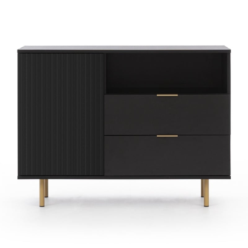 Nubia to komoda, która zachwyca od pierwszego wejrzenia. Jej czarna konstrukcja nadaje wnętrzu elegancji i nowoczesnego uroku. Nubia została wyposażona w złote nóżki i uchwyty, a na jej froncie znajdziesz dekoracyjne ryflowanie, które sprawia, że mebel prezentuje się niezwykle szykownie.Nubia to nie tylko piękno, ale także funkcjonalność. Komoda wyposażona jest w dwie zamykane szafki oraz trzy pojemne szuflady. Dzięki temu z łatwością przechowasz w niej wszystkie niezbędne przedmioty i różnego rodzaju drobiazgi. Daj swojemu wnętrzu nowe życie i stwórz stylowe otoczenie, w którym z przyjemnością spędzisz czas z rodziną i przyjaciółmi. Wybierz komodę Nubia i ciesz się harmonią oraz funkcjonalnością w swoim salonie.