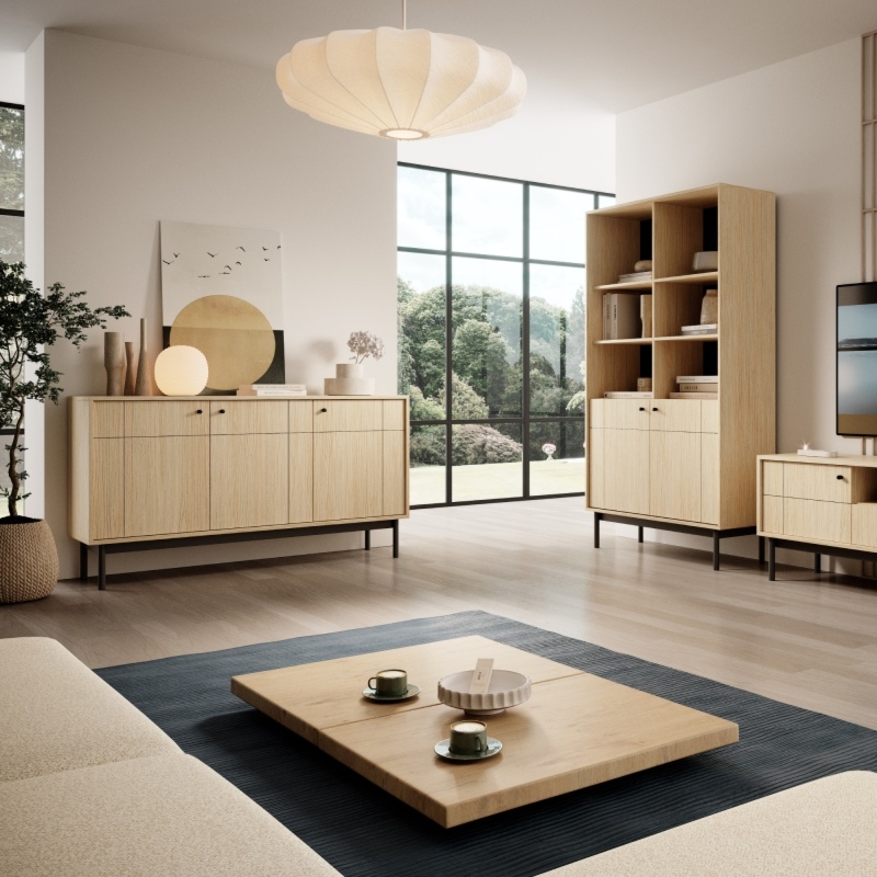 Komoda Japandi łączy w sobie nowoczesny wygląd i wygodę użytkowania. Jej eleganckie wykończenie w kolorze dąb linea nadaje stylowy, a zarazem subtelny charakter, który świetnie wpasuje się w różne aranżacje wnętrz.