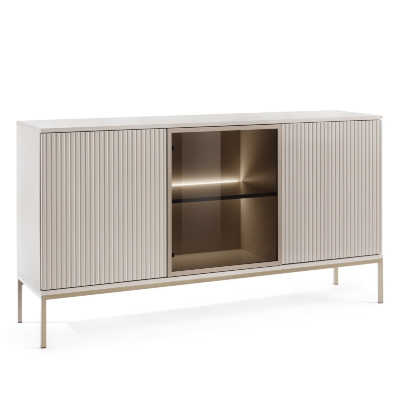 Komoda Sento zachwyca swoim frezowanym frontem wykonanym w kolorze kaszmirowym, który nadaje meblowi niepowtarzalnego uroku, wprowadzając do Twojego wnętrza nutę elegancji i przytulności. Korpus utrzymany w kolorze szampańskim, idealnie komponuje się z całością, dodając jej wyjątkowego charakteru.Jedne drzwi wyposażone w hartowane szkło to nie tylko estetyczny akcent, ale także praktyczne rozwiązanie. Pozwala ono na subtelne eksponowanie wybranych przedmiotów wewnątrz komody, dodając elegancji Twoim ulubionym dekoracjom czy kolekcjom. Dodatkowo, dzięki zastosowaniu oświetlenia LED, każda prezentowana na półkach rzecz staje się jeszcze bardziej widoczna i efektowna. W dwóch pozostałych szafkach możesz bezpiecznie przechowywać różnego rodzaju akcesoria, utrzymując porządek w swoim salonie.