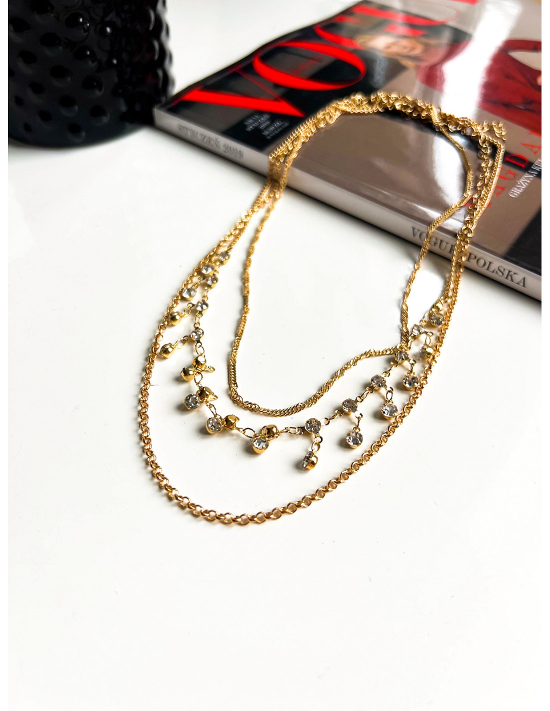 Komplet biżuterii z błyszczącymi akcentami -złoty Prezentujemy zachwycający komplet naszyjników, który jest esencją luksusu i subtelności dla każdej kobiety. Ten złożony z trzech warstw złoty naszyjnik, zdobiony drobnymi, lśniącymi zawieszkami, jest idealny, aby dodać nutę wyrafinowania do każdej stylizacji. Delikatne łańcuszki o różnych fakturach tworzą grę świateł, która przyciąga wzrok i podkreśla urok każdego dekoltu. Każda zawieszka lśniąca niczym drobna diamentowa łza, jest starannie rozmieszczona, by zapewnić maksymalny efekt blasku. Ten komplet naszyjników został zaprojektowany z myślą o uniwersalności, doskonale komponując się z garderobą od casualowej do wieczorowej. Bez względu na to, czy wybierzesz go do biurowego stroju, czy na specjalne wyjście, ten naszyjnik będzie zawsze stylowym i przyciągającym uwagę dodatkiem. To ponadczasowy element biżuterii, który powinien znaleźć się w kolekcji każdej modnej kobiety, ceniącej klasę i niebanalny design.