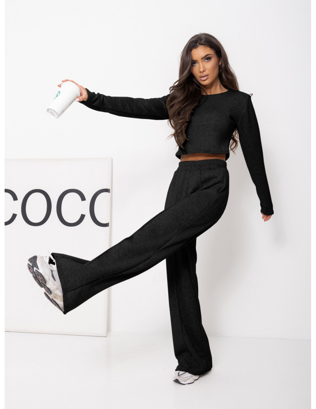 Komplet dzianinowy z szerokimi spodniami DANEB – czarny Ten bawełniany komplet to hit sezonu wiosennego, który łączy styl i wygodę w jednym! Oversizowy crop top z długimi rękawami zakończonymi otworami na kciuki zapewnia swobodę ruchów i modny look, idealny na każdą okazję. Szerokie spodnie z przeszyciami imitującymi kanty oraz szeroką gumą w pasie gwarantują doskonałe dopasowanie i wyjątkowy komfort noszenia. Wykonany z miękkiej i przewiewnej dzianiny bawełnianej, jest świetnym wyborem na wypad za miasto lub spacer z przyjaciółmi. Stylizuj go z modną pikowaną kamizelką i sneakersami, aby podkreślić casualowy charakter zestawu. Możesz nosić go zarówno w komplecie, jak i osobno, tworząc nowe, oryginalne stylizacje. To uniwersalna propozycja dla kobiet, które cenią sobie trendy look i niezobowiązującą elegancję. Odkryj swój styl i poczuj się wyjątkowo w każdej sytuacji w naszym czarnym komplecie Daneb!