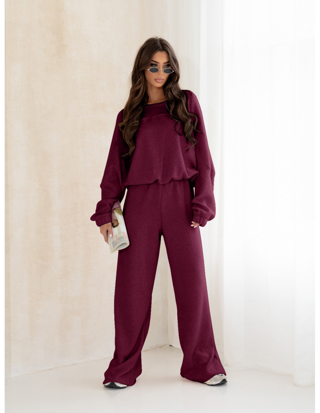 Komplet dzianinowy z szerokimi spodniami MILENA – bordowy Ten komplet to idealne połączenie swobodnej elegancji i wygody, które sprawdzi się w każdej garderobie. Oversizowa bluza z szerokimi rękawami i lekko opadającym dekoltem nadaje całości nonszalanckiego charakteru, a elastyczny dół subtelnie podkreśla sylwetkę. Dopełnieniem zestawu są szerokie spodnie z wysokim stanem, które zapewniają pełną swobodę ruchów i optycznie wydłużają nogi. Miękka, przyjemna w dotyku dzianina sprawia, że komplet jest doskonałym wyborem zarówno na co dzień, jak i na bardziej dopracowane stylizacje. Możesz zestawić go ze sneakersami dla casualowego looku lub dobrać eleganckie akcesoria, tworząc efektowną stylizację na wyjście. Ten bordowy komplet łączy wygodę z modowym charakterem.