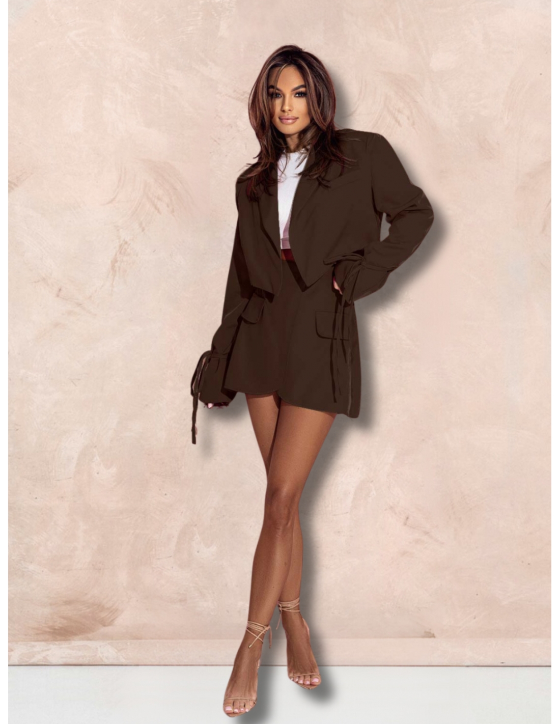 Komplet marynarka i spódnico-spodenki HOLLI – czekoladowy Postaw na styl i wygodę z naszym modnym kompletem HOLLI, który łączy elegancję marynarki z praktycznością spódnicospodenek. Ozdobne sznurki przy rękawach dodają całości unikalnego charakteru, a klapki od kieszeni na spódnicospodenkach stanowią stylowy akcent, który przyciąga uwagę. Ten zestaw w klasycznym kolorze bordo to idealny wybór na co dzień, jak i na bardziej formalne okazje. Stylizuj go z eleganckimi sandałami na obcasie i delikatną biżuterią, aby stworzyć subtelny, kobiecy look na wieczorne wyjścia. Na co dzień połącz go z białymi sneakersami i torebką na ramię, aby uzyskać casualowy, miejski styl. Możesz również dodać lekki top i minimalistyczne dodatki, aby podkreślić jego elegancję i wygodę. Ten komplet to must-have dla kobiet, które cenią sobie nowoczesny design i komfort noszenia. Wybierz komplet HOLLI w kolorze czekoladowym aby zawsze wyglądać modnie i stylowo!