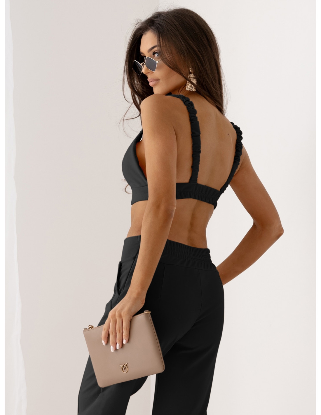 Komplet top na ramiączkach i spodnie TIRA – czarny Ten modny komplet będzie perfekcyjnym wyborem dla każdej kobiety, która ceni stylowy wygląd i komfort noszenia. Top z rozciągliwymi ramiączkami pięknie eksponuje ramiona, a dzięki szerokiej gumie z tyłu idealnie dopasowuje się do sylwetki, zapewniając swobodę ruchu. Dopełnieniem zestawu są spodnie dzwony z eleganckim przeszyciem, które optycznie wydłużają nogi i nadają stylizacji charakteru. Spodnie zapinane są z boku na subtelny zamek, który pozostaje niemal niewidoczny, a z tyłu posiadają gumę zapewniającą idealne przyleganie do figury. Dodatkowym atutem spodni są praktyczne kieszenie, które podkreślają ich casualowy charakter. Ten zestaw świetnie sprawdzi się w połączeniu z marynarką, szpilkami i efektowną biżuterią na eleganckie spotkania lub kolacje. Dla swobodniejszego looku zestaw go z jeansową kurtką, sneakersami i dużą torbą shopperką. Czarny kolor kompletu pozwala na tworzenie wielu różnorodnych stylizacji na różne okazje.