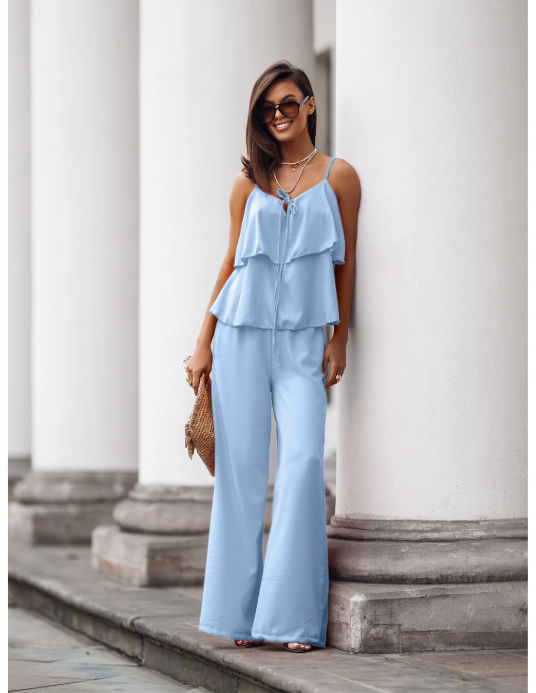 Komplet top z szerokimi spodniami AMARE – błękitny Poznaj nasz kobiecy komplet damski, który podbije Twoją letnią garderobę! Składa się z uroczej bluzki top złożonej z dwóch falban na cienkich ramiączkach oraz szerokich spodni z kieszeniami i gumą w pasie, zapewniających maksymalny komfort. Uszyty z przyjemnego, lejącego materiału, który pięknie układa się na sylwetce i sprawia, że noszenie go to czysta przyjemność. Ten zestaw to prawdziwy hit sezonu – trendy i idealny na lato, zarówno na wakacje, jak i na miejskie spacery. Dostępny w kilku letnich kolorach, które rozświetlą każdy dzień. Stylizuj go z plecioną torebką i sandałkami na obcasie, by uzyskać lekki, boho look. Załóż go także do espadryli i słomkowego kapelusza na letnie garden party – efekt “wow” gwarantowany! Komplet w kolorze błękitnym sprawdzi się na każdą okazję – łączy wygodę z kobiecym urokiem.