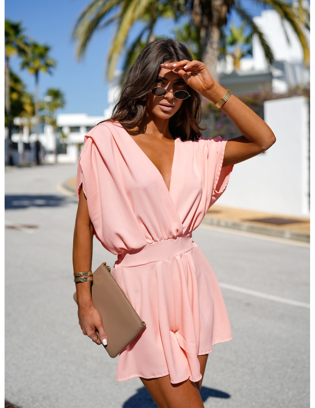 Krótki kombinezon z przekładanym dekoltem OLLI – pudrowy róż