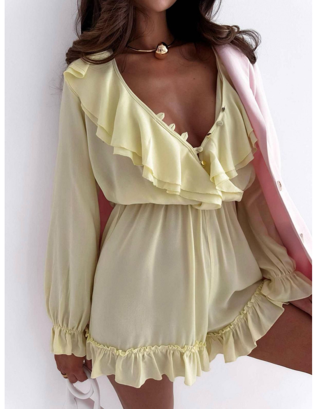 Krótki kombinezon z wiskozy z falbanami LUCA – cytrynowy Oczaruj wszystkich swoim stylem w tym kobiecym i niezwykle subtelnym kombinezonie z wiskozy. Delikatna tkanina pięknie układa się na sylwetce, zapewniając komfort noszenia nawet w upalne dni. Krótkie nogawki oraz długie rękawy zakończone uroczymi falbankami dodają całości romantycznego charakteru. Głęboki dekolt z dekoracyjnym obszyciem z falban i złotymi guzikami przyciąga spojrzenia i pięknie eksponuje linię szyi i ramion. Gumka w pasie podkreśla talię i optycznie modeluje sylwetkę, nadając jej lekkości. To idealna propozycja na letnie randki, garden party czy stylowe wyjścia z przyjaciółkami. Wystarczy dodać pastelową marynarkę (np. w różu), sandałki na obcasie i złotą biżuterię, by stworzyć pełen wdzięku, modny look. Ten cytrynowy kombinezon to esencja kobiecej delikatności i niezobowiązującej elegancji.