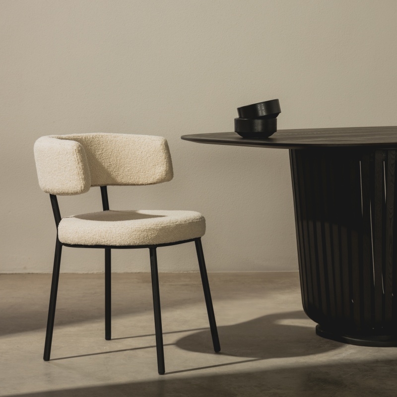 Wprowadź do swojego wnętrza krzesło Iga, łączące prostotę z nowoczesnym stylem! Czarna tkanina boucle to doskonały wybór dla tych, którzy cenią sobie komfort – jest miękka w dotyku i przyjemna w użytkowaniu