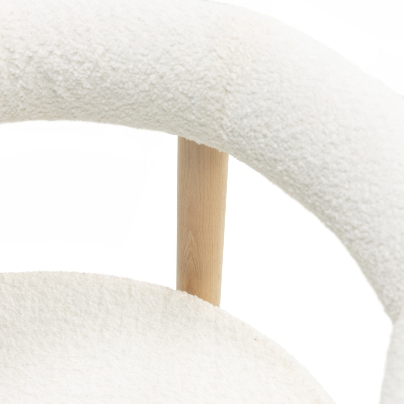 Krzesło Muffy to propozycja łącząca nowoczesny design z ponadprzeciętnym komfortem. Jego zaokrąglone oparcie doskonale otula plecy, zapewniając wygodę przez długie godziny. Trwała konstrukcja z drewna bukowego w naturalnym wybarwieniu stanowi solidną podstawę, a biała tkanina boucle nadaje mu subtelności i lekkości. Wybierz Muffy i wprowadź do swojego wnętrza nietuzinkowy akcent, który łączy funkcjonalność z ponadczasowym stylem.