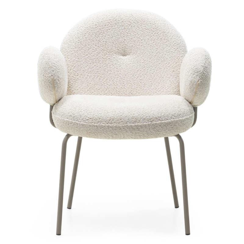 Harmonijne zaokrąglenia oraz designerskie podłokietniki nadają meblowi nowoczesny, a zarazem subtelny wygląd, który świetnie komponuje się z różnymi stylami aranżacji. Metalowa konstrukcja, również w beżowym odcieniu, gwarantuje stabilność i trwałość, nie przytłaczając przy tym delikatnej formy krzesła. Wypełnione pianką siedzisko dostosowuje się do ciała, zapewniając wygodę na najwyższym poziomie. Fiori to doskonałe połączenie estetyki i funkcjonalności, które doda charakteru każdemu pomieszczeniu.