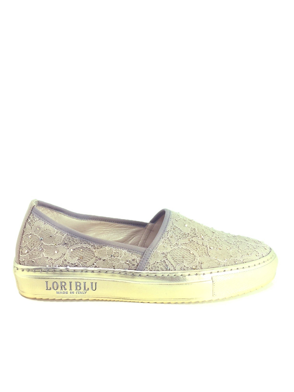 Ultramodne slip-on marki Loriblu w kolorze beżowym. Wykonane z najwyższej jakości materiału w koronkowy deseń. Efektowe zdobienie w postaci połyskujących kryształków nadaje całości nietuzinkowego charakteru. Kontrastującą podeszwę w kolorze złota wykończono logo firmy. Niezwykle efektowny i przykuwający uwagę model.