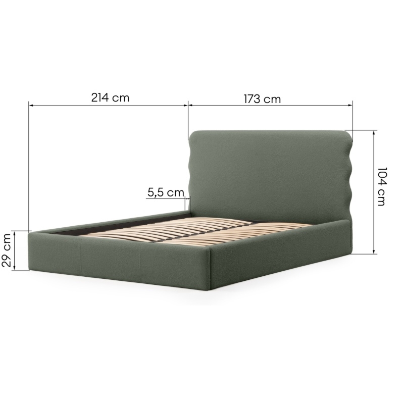 Łóżko Bolge wprowadzi nową jakość komfortu i stylu do Twojej sypialni. Jego zagłówek urzeka subtelnymi, falistymi liniami, które nadają mu unikalną, organiczną formę. Niezwykle miękka tkanina boucle w ciemnozielonym odcieniu, tworzy ciepły i przytulny klimat, który sprzyja relaksowi. Ponadto materiał ten powstał z przędzy wyprodukowanej z recyklingowanych tworzyw, co przyczynia się do ochrony naszego wspólnego środowiska.