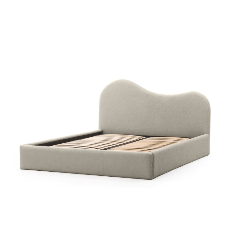 Łóżko tapicerowane 160×200 cm Munni, ze stelażem i pojemnikiem, beżowe, boucle, obłe kształty