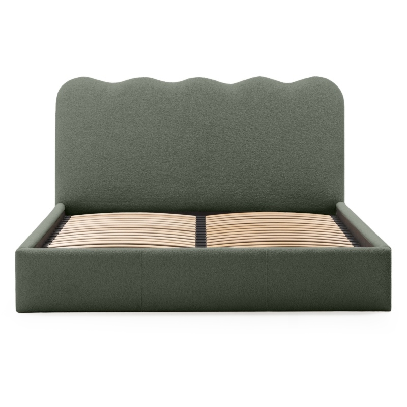 Łóżko Onda wprowadzi nową jakość komfortu i stylu do Twojej sypialni. Jego zagłówek urzeka subtelnymi, falistymi liniami, które nadają mu unikalną, organiczną formę. Niezwykle miękka tkanina boucle w ciemnozielonym odcieniu, tworzy ciepły i przytulny klimat, który sprzyja relaksowi. Ponadto materiał ten powstał z przędzy wyprodukowanej z recyklingowanych tworzyw, co przyczynia się do ochrony naszego wspólnego środowiska.