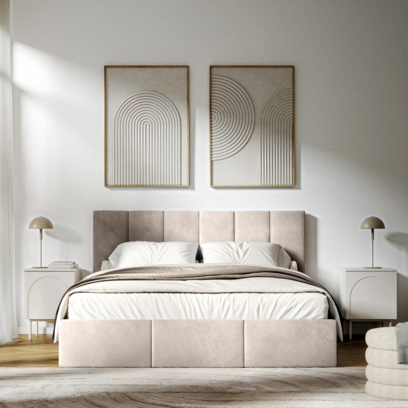 Łóżko tapicerowane Simple 160×200 cm z pojemnikiem, welurowe, jasnobeżowe