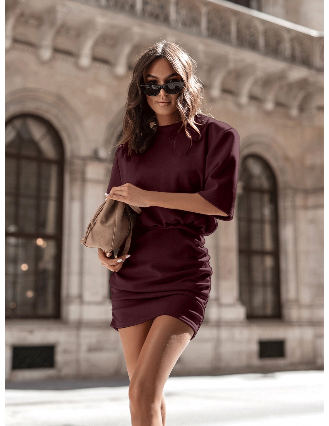 Masełkowa sukienka mini z marszczeniem ZAMIA – bordowa Sukienka mini o oversizowej górze i marszczonym dole to prawdziwa perełka wśród miejskich stylizacji! Uszyta z przyjemnego, elastycznego materiału z domieszką wiskozy, gwarantuje komfort noszenia i perfekcyjne dopasowanie do sylwetki. Luźna góra z rękawem do łokcia tworzy efekt swobodnego luzu, który pięknie kontrastuje z dopasowanym, marszczonym dołem podkreślającym kobiece kształty. Marszczenia optycznie modelują figurę i dodają całości modowego charakteru. To idealna propozycja na codzienne wyjścia, randki czy city breaki – wystarczy dodać botki na grubej podeszwie i ramoneskę, by stworzyć look w klimacie fashion streetwear. Na wieczór połącz ją z marynarką i szpilkami – efekt wow gwarantowany! Bordowy kolor sprawia, że sukienka łatwo wpisuje się w każdą kapsułową garderobę. Stylowa, wygodna i totalnie na czasie – właśnie taka powinna być Twoja nowa ulubiona sukienka!