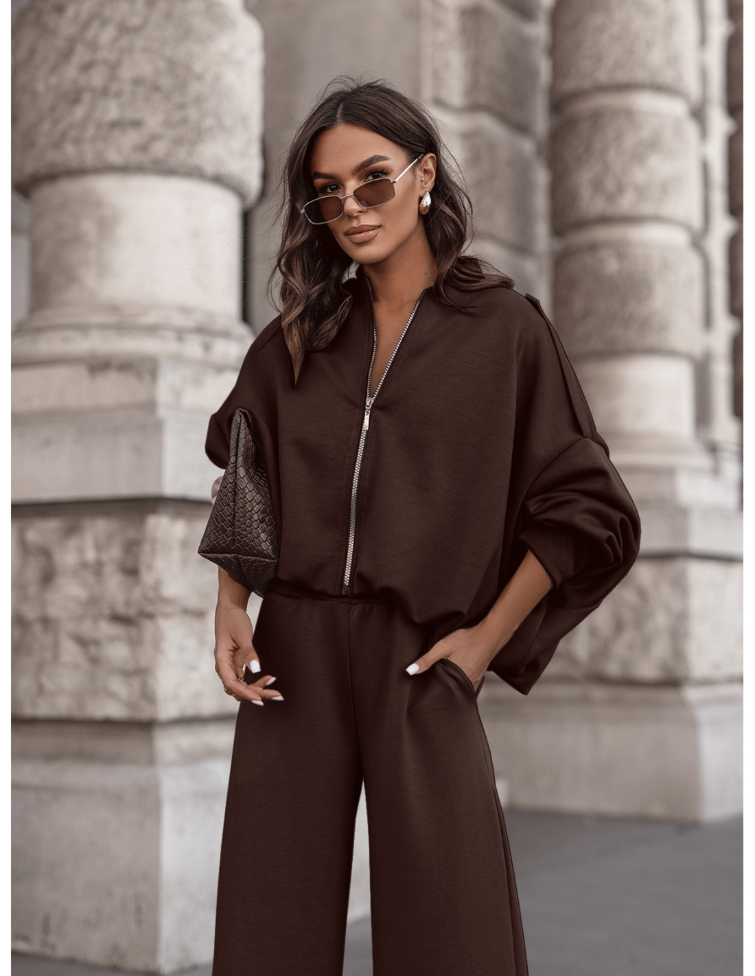 Masełkowy dres z szerokimi spodniami SORGO – czekoladowy Stylowy komplet dresowy 2w1 w modnych, jesiennych odcieniach to must-have na chłodniejsze dni! Krótka bluza bombka z podszewką, zapinana na zamek, zachwyca kimonowym krojem, pagonami i elegancką stójką, nadając całości unikatowy, miejski charakter. Szerokie spodnie z kieszeniami i grubą gumą w pasie zapewniają nie tylko wygodę, ale i maksymalny efekt wow przy każdym ruchu. Całość została uszyta z przyjemnego, elastycznego materiału z domieszką wiskozy, który idealnie dopasowuje się do sylwetki i pięknie się układa. To połączenie stylu, komfortu i jakości, które pokochasz już od pierwszego założenia. Noś zestaw razem dla efektu total look lub osobno – bluzę łącz z dżinsami lub spódnicą midi, a spodnie z białą koszulą i trenczem. Idealny wybór zarówno na co dzień, jak i na weekendowy city walk. Jesienne trendy właśnie zyskały nową gwiazdę – ten czekoladowy komplet to modowy strzał w dziesiątkę!
