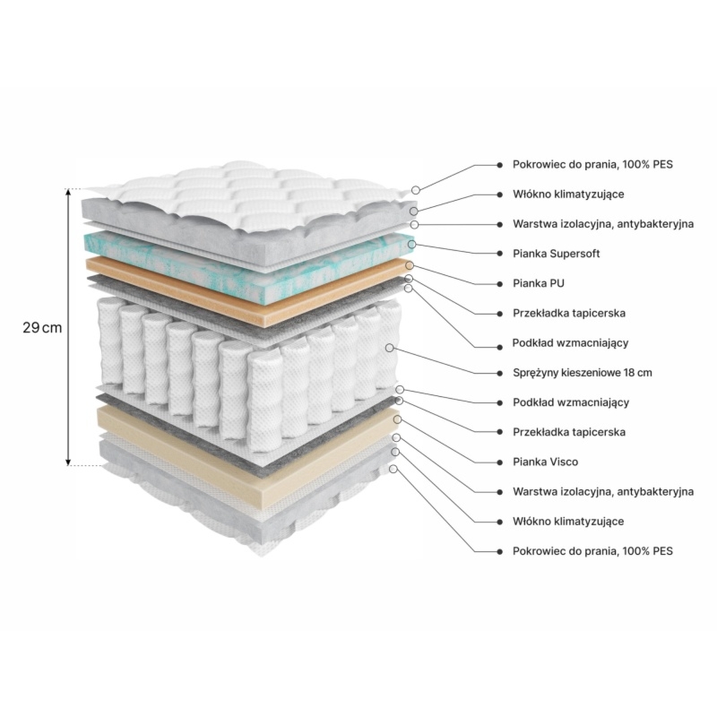Breeze to materac, który przeniesie Twój komfort snu na zupełnie nowy poziom. Jego wielowarstwowa konstrukcja o wysokości 29 cm łączy innowacyjne technologie z wyjątkowym komfortem.