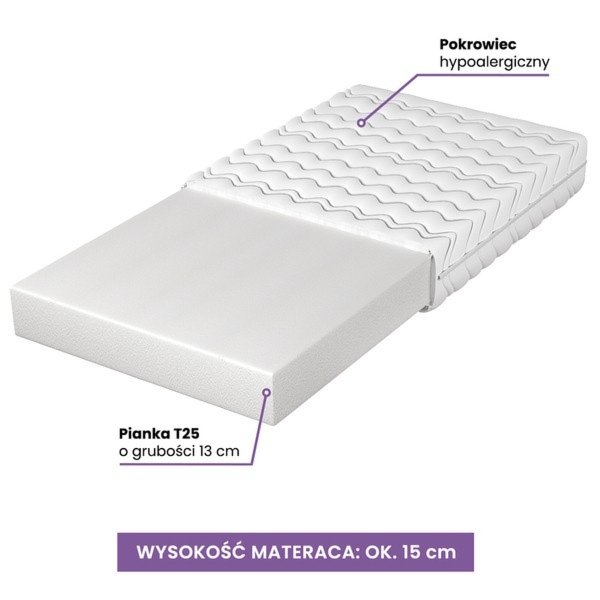 Materac dwustronny średnio twardy, 90 x 190 cm, piankowy. Siesta to materac piankowy wykonany z bezpiecznych materiałów przebadanych na obecność szkodliwych substancji przez co może być używany przez osoby z alergią.
