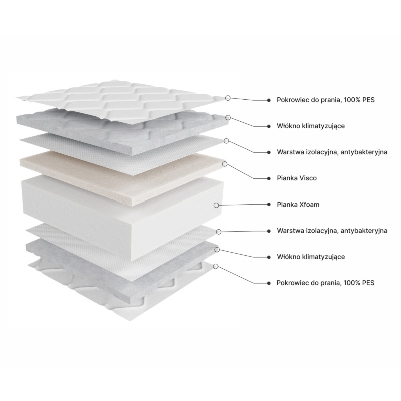 W zestawie znajduje się również pokrowiec, który nie tylko dodaje estetycznego wyglądu, ale także zapewnia doskonałą cyrkulację powietrza. To innowacyjne rozwiązanie pozwala utrzymać materac w świeżości na dłużej, tworząc optymalne warunki dla zdrowego i komfortowego wypoczynku.