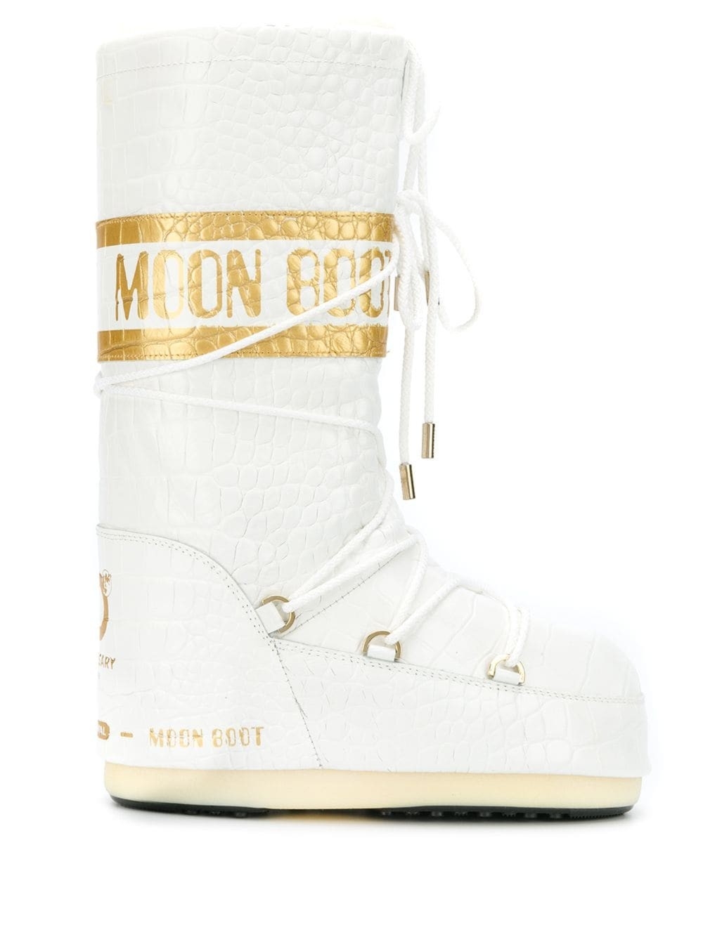 Limitowany model kultowych śniegowców marki Moon Boot, zaprojektowany ku uczczeniu 50-tej rocznicy istnienia marki. Cholewka wykonana została z naturalnej skóry cielęcej, którą zdobi tłoczenie imitujące skórę krokodyla. Wnętrze buta wyścielone zostało miękkim owczym futrem oraz piankowym materiałem który idealnie dopasowuje się do stopy i izoluje ją przed zimnem. Zakładanie oraz zdejmowanie buta ułatwiają dwie pary sznurowadeł. Buty zostały wyposażone w antypoślizgową podeszwę wykonaną z termoplastycznego kauczuku, który ułatwia chodzenie i utrzymanie stabilność na każdej powierzchni. Wokół łydki umieszczono widoczne logo firmy. Wygoda i komfort, a za razem niepowtarzalny look.