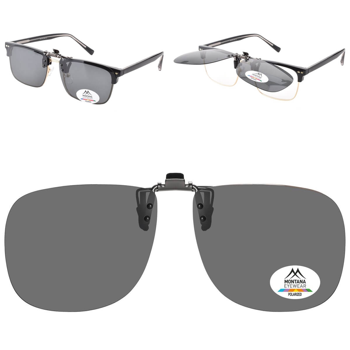 Czarne uchylne nakładki przeciwsłoneczne nakładane na okulary korekcyjne marki Montana   ➤ Soczewki przeciwsłoneczne w kolorze czarnym z polaryzacją oraz filtrem UV400 ➤ Posiadają system mocowania do oprawek okularowych na klips z możliwością uchylenia bez konieczności ich demontażu