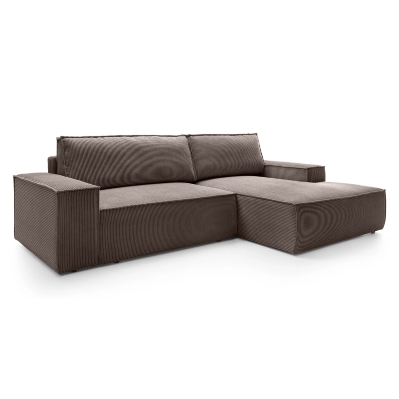 Narożnik Fiord to mebel o prostym, nowoczesnym designie, który doskonale komponuje się z większością aranżacji. Obity jest miękką i przyjemną w dotyku tkaniną sztruksową w brązowym kolorze. Materiał ten posiada technologię pet friendly, przez co świetnie sprawdzi się we wnętrzach wszystkich wielbicieli zwierząt.Doskonałym rozwiązaniem w tym modelu jest funkcja spania oraz praktyczny pojemnik na pościel. Dzięki takiemu rozwiązaniu zyskasz dodatkowe miejsce zarówno do odpoczynku, jak i do przechowywania niezbędnych przedmiotów. Szeroka otomana narożnika oraz miękkie poduchy oparciowe zapewniają bardzo komfortowe użytkowanie.