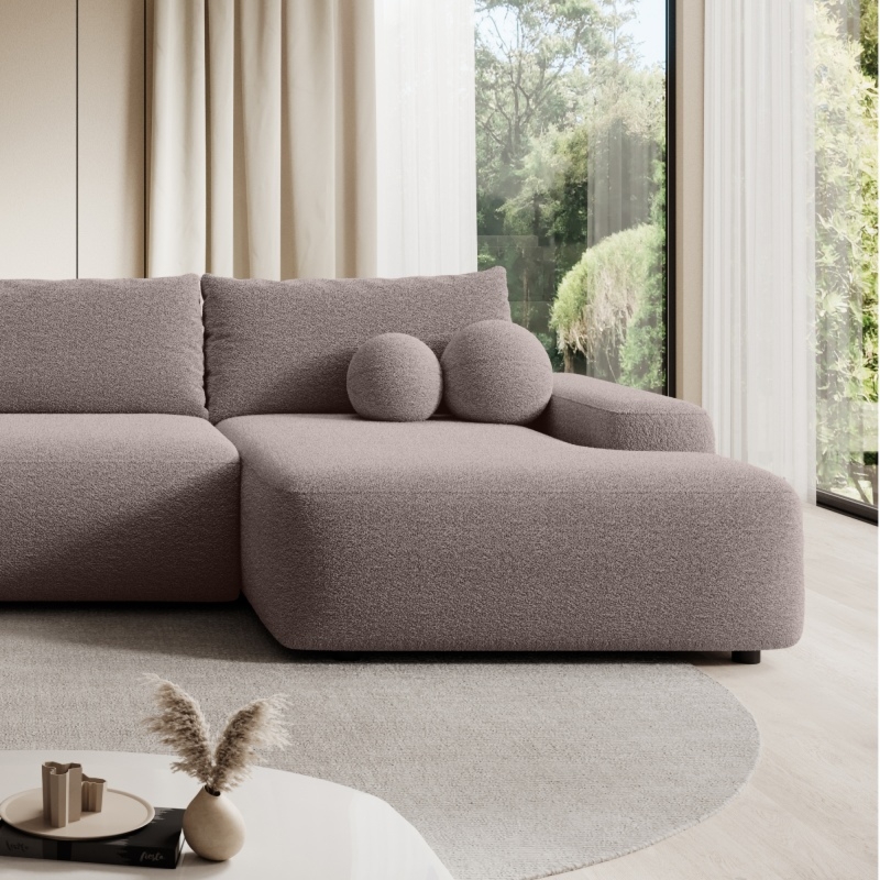 Stwórz w swoim salonie strefę relaksu i komfortu. Narożnik Loop U1 zachwyca nietuzinkowym designem i brązowoszarym obiciem z tkaniny boucle, które pasuje do wielu aranżacji wnętrz. Jego kształt litery U oraz miękkie poduchy oparciowe i zintegrowany pojemnik na pościel czynią go idealnym miejscem do odpoczynku, a funkcja spania DL pozwala na szybkie przekształcenie go w wygodne łóżko dla gości.