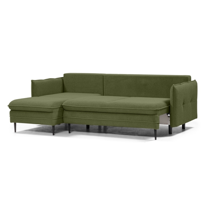 Narożnik rozkładany z pojemnikiem Notti, oliwkowozielony, boucle, lewostronny