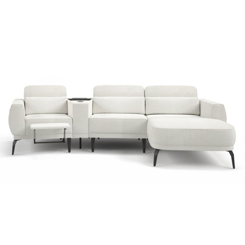 Obicie z jasnobeżowej tkaniny boucle Loop zachwyca subtelną fakturą i przyjemną w dotyku strukturą, nadając narożnikowi przytulny, a zarazem elegancki charakter. Całość dopełniają smukłe czarne nóżki, które wprowadzają lekkość i nowoczesny akcent. Velumo to mebel, który dba o Twój relaks – łączy komfort, technologię i świetny design w jednej, wyjątkowej formie.