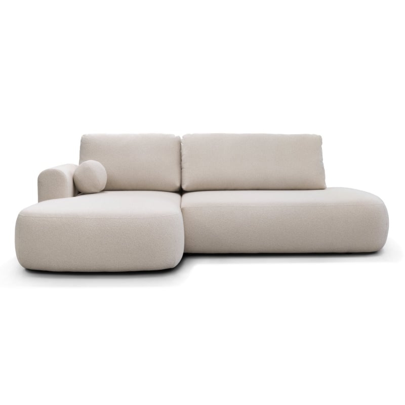 Narożnik z funkcją spania i pojemnikiem Ariola, obłe kształty, jasnobeżowy, boucle, lewy