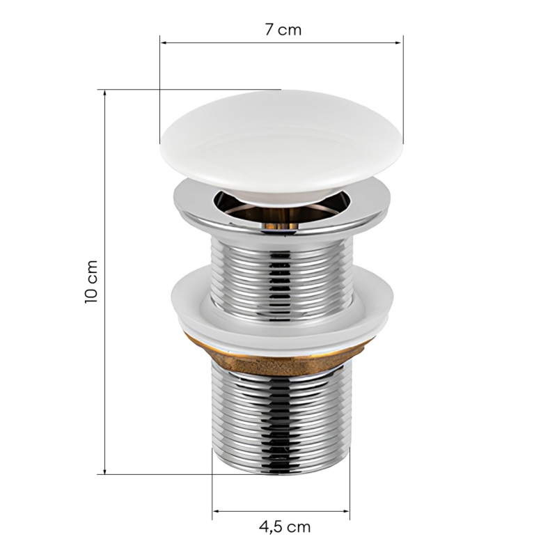 Holyshi to okrągły korek wykonany z solidnego metalu, dostosowany do umywalek z przelewem i zachwycający swoim eleganckim białym, matowym wykończeniem. Jego trwała konstrukcja z metalu zapewnia nie tylko estetykę, ale również długotrwałą funkcjonalność. Zawór odpływowy otwiera się i zamyka jednym prostym kliknięciem korka od góry.