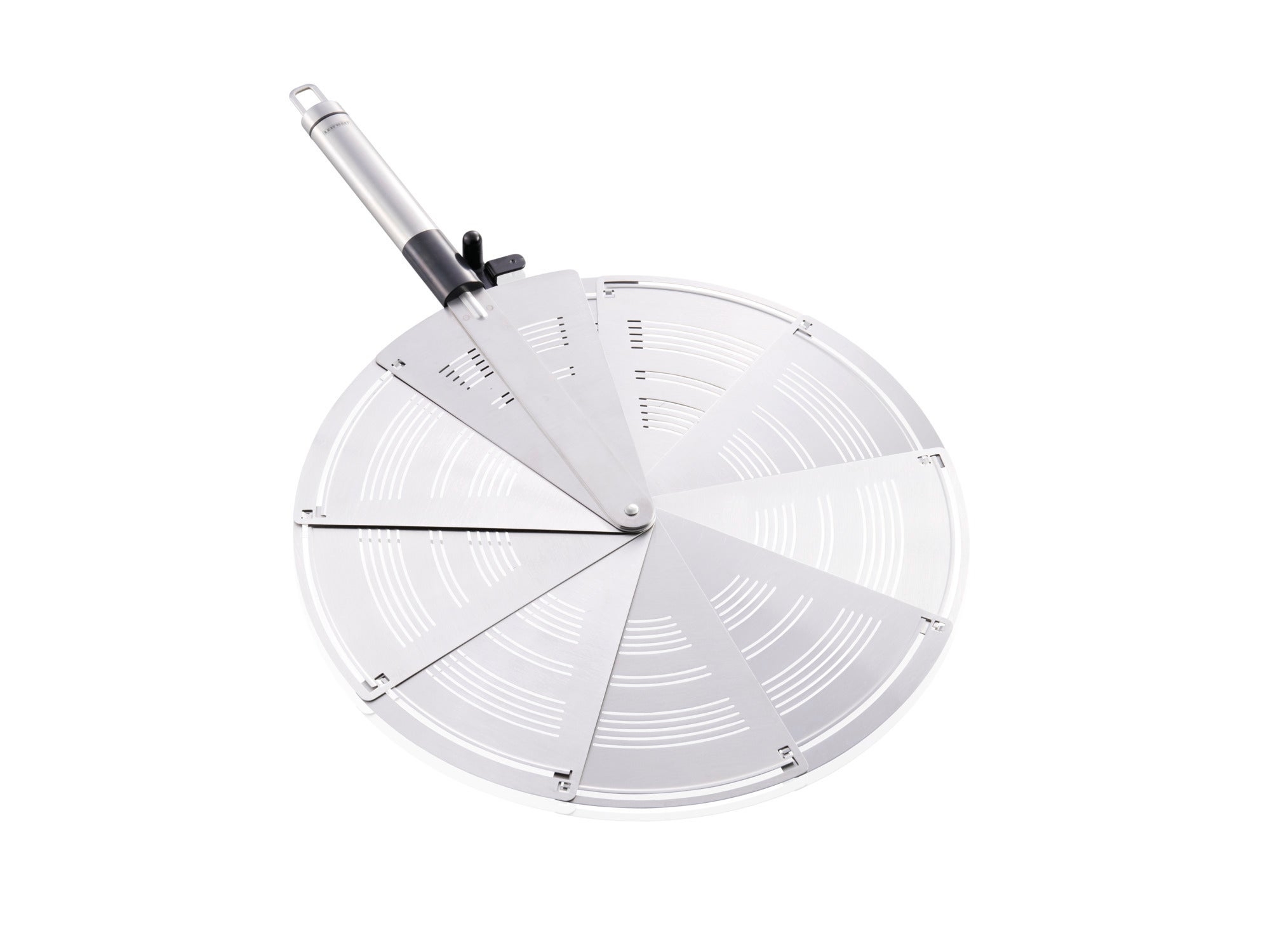Osłona przeciwrozpryskowa metalowa marki Leifheit pasuje do garnków i patelni o średnicy do 28 cm. Dzięki możliwości złożenia osłony do wielkości łopatki do ciasta oszczędza się miejsce, gdy nie jest ona używana. Przed niekontrolowanym złożeniem lub rozłożeniem chroni niezawodna blokada znajdująca się przy rękojeści. Model ten ławo utrzymuje się w czystości – nadaje się do mycia w zmywarce. Przy uchwycie znajduje się otwór umożliwiający zawieszenie na haczyku.