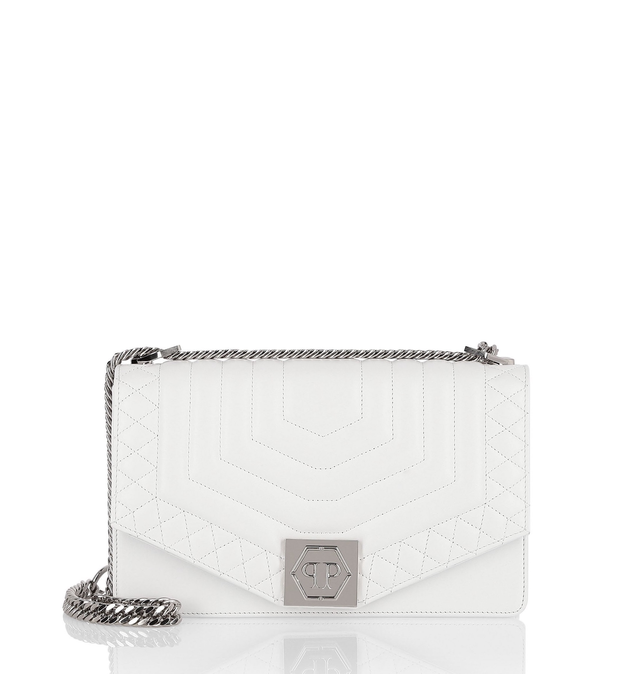 Elegancka torebka marki Philipp Plein. Wykonana z najwyższej jakości włoskiej skóry licowej wykończonej modnym pikowaniem. Zapinana z przodu na ozdobną klamrę z charakterystycznym dla projektanta logo. Wewnątrz umieszczono jedną dużą komorę oraz dodatkową kieszeń. W komplecie znajduje się pasek wykonany z połączenia metalowego łańcuszka i skórzanego naramiennika, umożliwiający noszenie torebki na ramieniu lub crossbody.