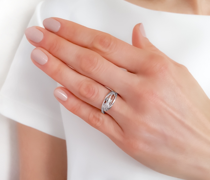Śliczny pierścionek zaręczynowy w kształcie konwalii, z oprawionym centralnie białym brylantem
