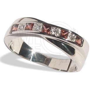 Białe złoto próby 0,585 szczególnie uwypukla zjawiskową urodę pięciu soczyście czerwonych granatów o łącznej masie blisko 0,25 karata