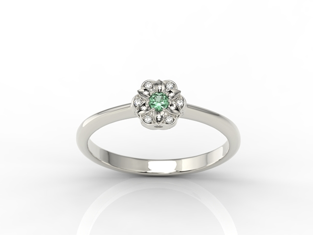 Śliczny pierścionek w kształcie konwalii, z oprawionym centralnie białym brylantem