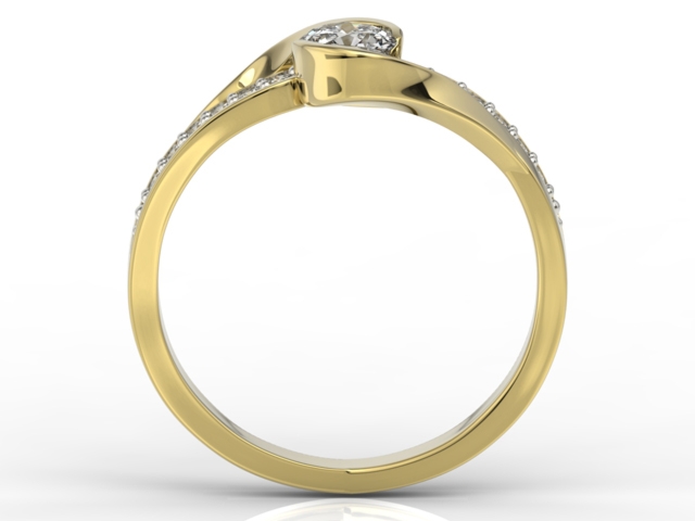 Okazała, poprowadzona z precyzją linia złotej obrączki okraszona aż trzynastoma diamentami o łącznej masie 0,39 ct. Zestawienie żółtego kruszcu próby 0,585 i ponad tuzina kamieni składa się na projekt monumentalny, utrzymany w królews