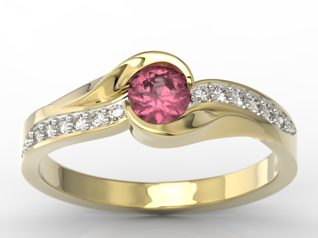Rubinowe serce w iście królewskiej oprawie. Rodowane złoto o próbie 0,585 tworzy nienachalne tło i pozwala należycie wyeksponować piękno szlachetnego, centralnego oczka i blask towarzyszących mu dwunastu diamentów o łącznej masie 0,12