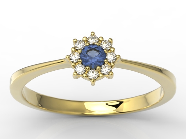 W żółtym złocie próby 0,585 spoczywa mistyczny szafir o masie 0,15 karata otoczony szlifowanymi diamentami ważącymi w sumie 0,08 karata